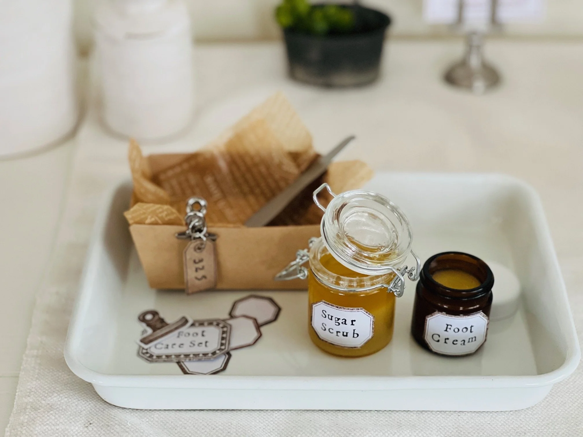 シュガースクラブと、フットクリーム(バームに近い質感です。25ml容器の、小さめサイズとなります)の二つのアロマクラフト(そして写真には載っていませんが、足浴用のミニミニ・ソルト1回分用)を作成致します。